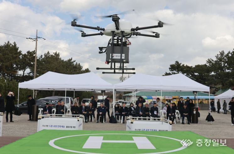충청일보 박사현 기자 | 보령시는 5일 오천면 원산도해수욕장관리사무소에서 '‘24년 주소체계 고도화 및 주소기반 혁신산업 창출'의 일환으로 드론과 무인 배송 로봇을 연계한 배송 실증 서비스 시연회를 성공적으로 마쳤다.