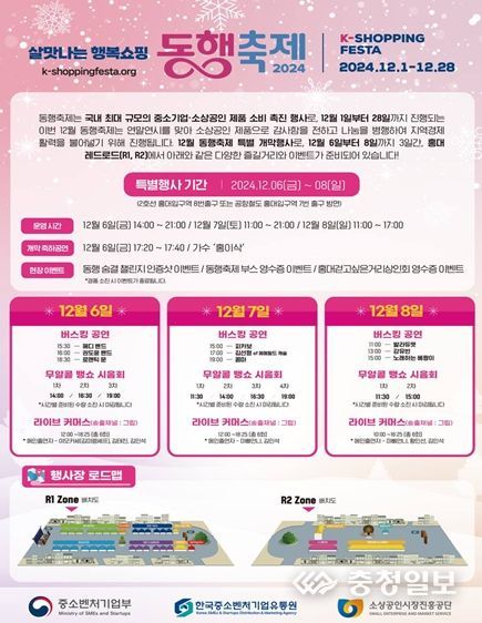 충청일보 김은경 기자 | 중소벤처기업부는 6일부터 8일까지 ‘12월 동행축제’ 개막행사를 열고, 다양한 중소기업·소상공인 제품 홍보·판매관을 운영한다고 밝혔다.
