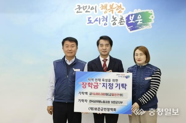 충청일보 김문호 기자 | 보은군공무원노조는 지난 18일 지역인재 육성을 위해 사용해 달라며 장학금 1,000만 원을 (재)보은군민장학회에 기탁했다.