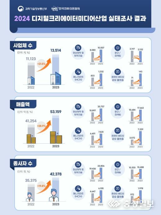 충청일보 김은경 기자 | 과학기술정보통신부와 한국전파진흥협회는 2023년 국내 디지털 창작자 매체(크리에이터 미디어) 산업의 현황을 살펴볼 수 있는'2024년 디지털크리에이터미디어산업 실태조사'결과를 발표했다.