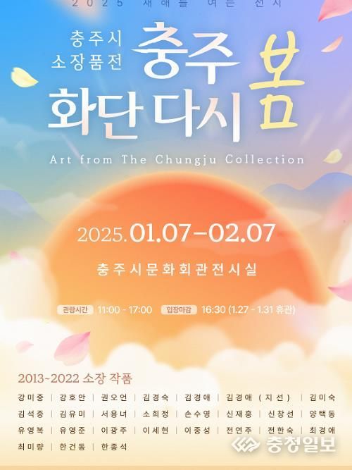 충청일보 김문호 기자 | (재)충주문화관광재단은 오는 1월 7일부터 2월 7일까지 2013년부터 2022년까지 수집한 충주시 미술품 수장고 소장품을 조명하는 ‘충주 화단 다시 봄’을 충주시문화회관 전시실에서 개최한다고 밝혔다.