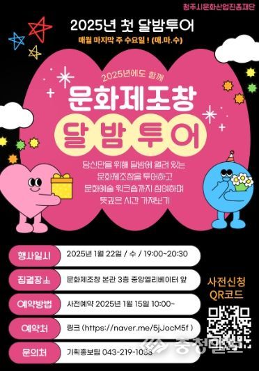 청주시문화산업진흥재단은 오는 22일 밤에 진행되는 ‘문화제조창 달밤투어’ 투어객을 오는 15일 오전 10시부터 모집한다.