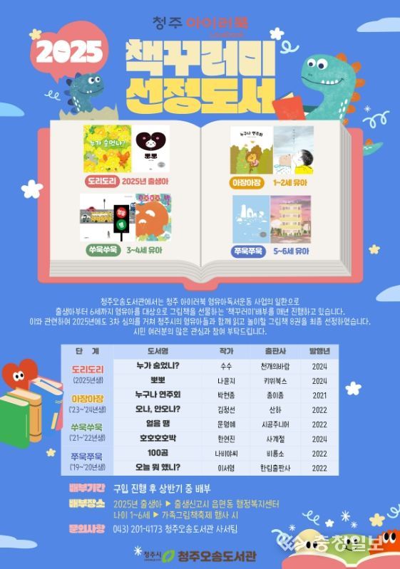 충청일보 김문호 기자 | 청주오송도서관은 청주시 영유아에게 선물할 올해의 책 꾸러미 도서 8권을 선정했다고 21일 밝혔다.