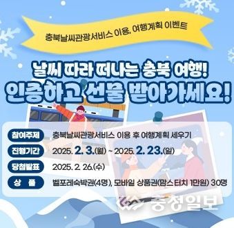 충청일보 김문호 기자 | 충북도가 기상빅데이터와 관광정보를 융합한 충북관광누리집(충북나드리) ‘충북날씨관광서비스’를 이용한 여행계획 세우기 이벤트를 진행한다고 밝혔다.