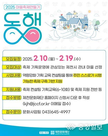 충청일보 김문호 기자 | (재)제천문화재단는 2월 10일부터 19일까지 2025 마을축제 만들기‘동행’에 참여할 마을 공동체 4곳을 모집한다고 3일 밝혔다.