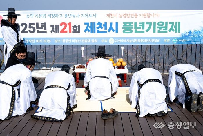 충청일보 김문호 기자 | 제천시농업경영인연합회는 지난 14일 청풍 비봉산 전망대 일원에서 올 한 해 풍년 농사를 기원하며 농업인의 화합 도모, 영농정보 교환 등을 위해 회원과 관계기관 150여 명이 참석한 가운데 제21회 풍년농사기원제를 개최했다.
