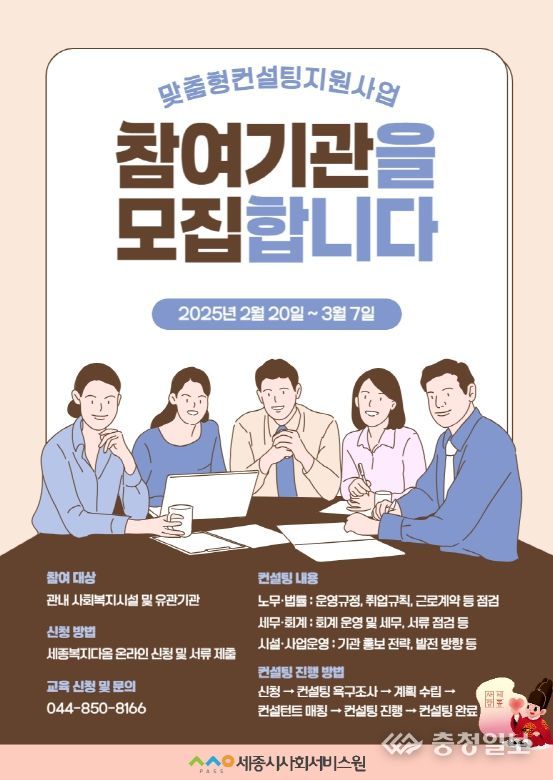 충청일보 김정운 기자 | 세종시사회서비스원(김명희 원장)은 내달 7일까지 관내 사회복지시설을 대상으로 맞춤형컨설팅지원사업 참여기관을 모집한다고 밝혔다.