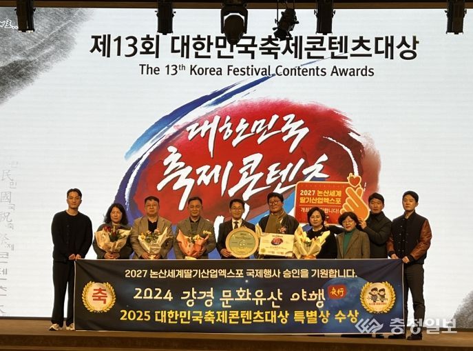 충청일보 박사현 기자 | ‘강경 문화유산 야행’이 25일 서울 전쟁기념관 내 피스앤파크컨벤션에서 개최된 제13회 ‘대한민국축제콘텐츠대상’에서 축제프로그램 특별상을 수상했다.