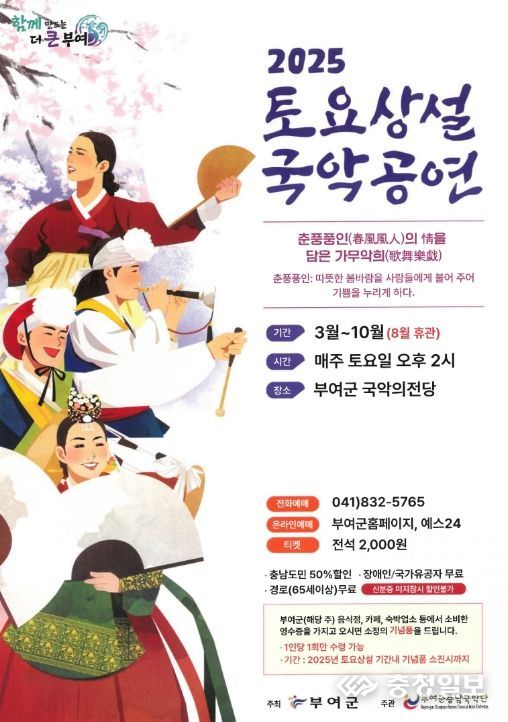 공연은 10월까지(8월 제외) 매주 토요일 오후 2시 부여국악의전당에서 열리고 부여군충남국악단 공연기획실로 전화 및 온라인(예스24)으로 예매할 수 있다.