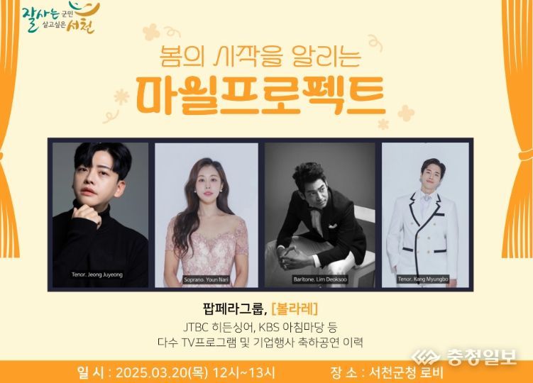 충청일보 박사현 기자 | 서천군이 오는 3월 20일 정오에 군청 로비에서 ‘청사 마실 프로젝트’의 첫 행사로 팝페라 공연 ‘열정과 패기의 서천’을 개최한다.