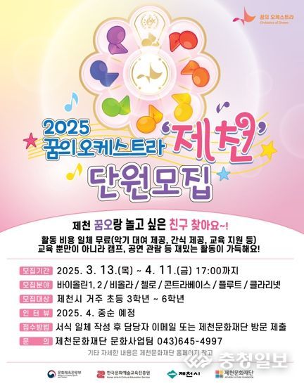충청일보 김문호 기자 | (재)제천문화재단은 지난 3월 13일부터 4월 11일까지 꿈의 오케스트라 ‘제천’ 단원을 모집한다고 밝혔다.