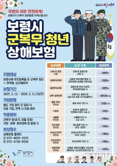충청일보 박사현 기자 | 보령시는 군 복무 중인 청년을 대상으로 상해보험을 가입하고 복무 중 입은 사고에 대해 최대 3천만 원까지 보상하는 ‘군 복무 청년 상해보험’을 시행한다고 밝혔다.