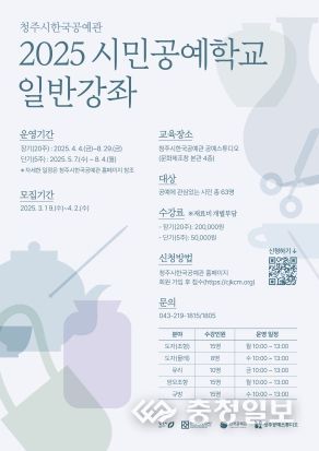 충청일보 김문호 기자 | 청주시와 청주시한국공예관은 다음달 2일까지 ‘2025 시민공예학교’ 일반강좌 수강생을 모집한다고 23일 밝혔다.
