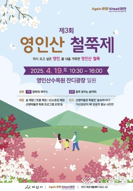 충청일보 박사현 기자 | 아산시가 19일 영인산 수목원 잔디광장 일원에서 ‘제3회 영인산 철쭉제’를 개최한다.