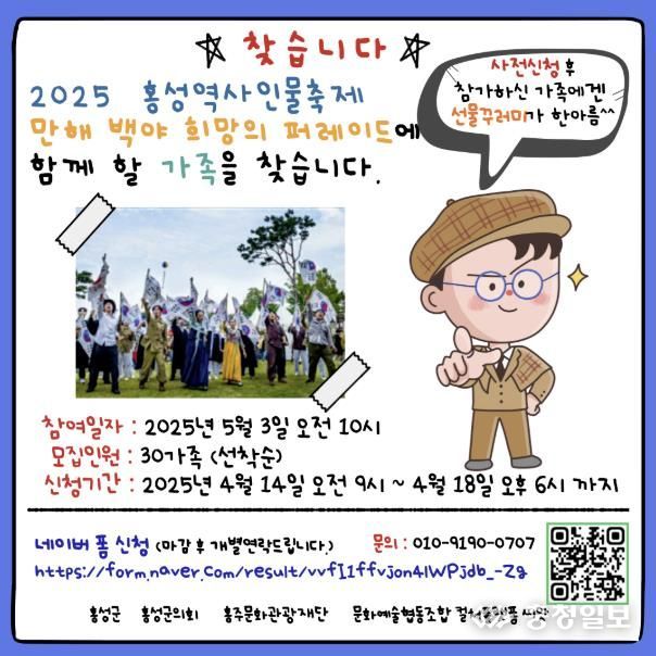 충청일보 박사현 기자 | 홍주문화관광재단이 오는 5월 3일부터 4일까지 홍주읍성에서 개최되는‘2025 홍성역사인물축제×어린이날 큰잔치’거리 퍼레이드 행사 참가자를 모집한다고 밝혔다.