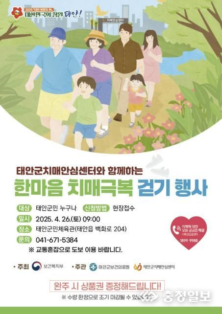충청일보 박사현 기자 | 태안군이 치매 친화적 환경 조성을 위한 뜻깊은 걷기 행사를 마련한다.