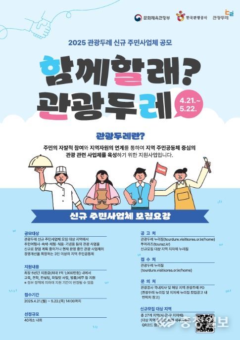 충청일보 김은경 기자 | 문화체육관광부는 한국관광공사와 함께 4월 21일부터 5월 22일까지 2025년 ‘관광두레’에 참여할 신규 주민사업체를 공모한다.