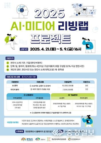 충청일보 박사현 기자 | (재)충남정보문화산업진흥원은 오는 5월 9일까지 천안의 지역 사회 문제 해결에 주민이 함께 참여하는 ‘AI·미디어 리빙랩 프로젝트’ 참가자를 모집한다고 밝혔다.