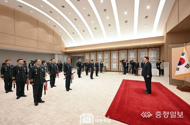충청일보 김은경 기자 | 윤석열 대통령은 11월 6일 오후 용산 대통령실에서 곽종근 신임 특수전사령관을 비롯한 중장 진급자 12명으로부터 진급 및 보직신고를 받고 삼정검에 수치를 수여했다. 이번 군 수치 수여식은 윤석열 정부들어 다섯 번째 수치 수여식이다.