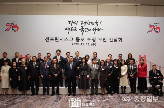충청일보 김은경 기자 | APEC 정상회의 참석을 위해 미국 샌프란시스코를 방문 중인 윤석열 대통령은 김건희 여사와 함께 오늘(현지 시각 11. 15, 수) 현지 동포를 초청해 오찬을 겸한 간담회를 했다. 이번 간담회는 샌프란시스코와 그 인근 지역에서 활발히 활동 중인 150여 명의 동포들이 참석한 가운데 진행됐다.