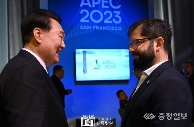 충청일보 김은경 기자 | APEC 정상회의 참석을 위해 미국 샌프란시스코를 방문 중인 윤석열 대통령은 오늘(현지시간 11. 16, 목) 오후 가브리엘 보리치(Gabriel Boric) 칠레 대통령과 취임 이후 처음으로 정상회담을 가졌다.