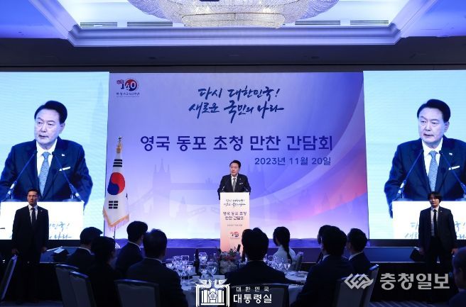 충청일보 김은경 기자 | 찰스 3세 영국 국왕의 초청으로 영국을 국빈 방문 중인 윤석열 대통령은 김건희 여사와 함께 오늘(현지시각 11. 20, 월) 오후 현지 동포를 초청하여 만찬을 겸한 간담회를 했다. 이번 간담회는 영국 전역에서 활발히 활동 중인 200여 명의 동포들이 참석한 가운데 진행됐다.
