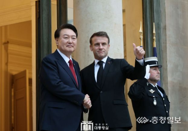 충청일보 김은경 기자 | 2030 부산세계박람회 유치 교섭을 위해 프랑스를 방문 중인 윤석열 대통령은 오늘 (현지시간 11. 24, 금) 엘리제궁에서 에마뉘엘 마크롱(Emmanuel Macron) 프랑스 대통령과 단독 정상회담을 갖고, 양국 간 미래산업 분야 실질 협력 강화 방안과 함께 한반도 정세, 중동 정세 등을 포함한 지역 정세 및 글로벌 현안에 대해 의견을 교환했다.