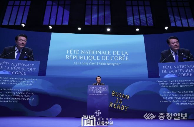 충청일보 김은경 기자 | 윤석열 대통령 부부는 2030 부산세계박람회 유치 성공을 위한 프랑스 파리 방문 둘째 날 마지막 공식 일정으로 오늘(현지시간 11. 24, 금) 저녁 프랑스 파리의 브롱냐르궁(宮)에서 개최된 국경일 리셉션에 참석했다.