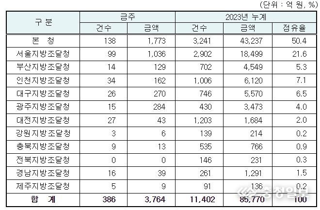 지역별 발주량을 보면 대전광역시 소재 본청 1,773억 원, 서울지방청 1,036억 원 등 2개청(2,809억 원)이 전체 금액(3,764억 원)의 74.6%를 차지하고 있으며, 인천 등 나머지 10개 지방청 955억 원이 각각 집행될 예정이다.