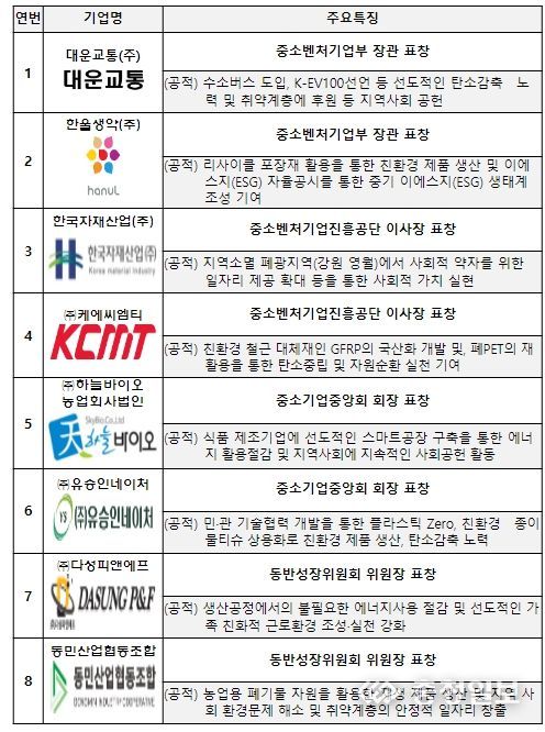 이번 ‘2023년 이에스지(ESG) 경영혁신대전’에서는 어려운 경영여건에서도 선도적으로 이에스지(ESG) 경영을 도입한 8개 중소기업을 발굴하여 포상했다.