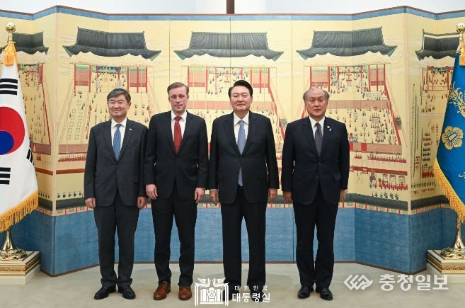 충청일보 김은경 기자 | 윤석열 대통령은 한미일 국가안보실장 회의 참석차 한국을 방문 중인 제이크 설리번(Jake Sullivan) 미국 국가안보보좌관과 아키바 다케오(秋葉 剛男) 일본 국가안전보장국장을 12월 8일 관저로 초청하여 국제 안보 정세와 한반도 안보 관련 주요 현안에 대해 의견을 나눴다.