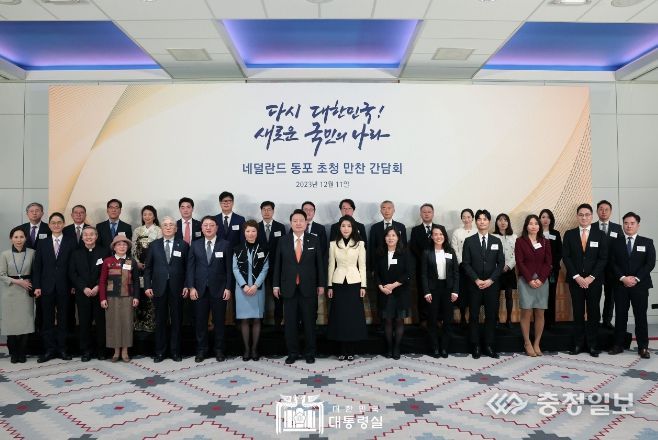 충청일보 김은경 기자 | 네덜란드를 국빈 방문 중인 윤석열 대통령은 김건희 여사와 함께 오늘(현지시간 12. 11, 월) 저녁 현지 동포 100여 명을 초청하여 만찬을 겸한 간담회를 가졌다. 이번 간담회는 네덜란드 전역에서 활발히 활동 중인 100여 명의 동포들이 참석한 가운데 진행됐다.
