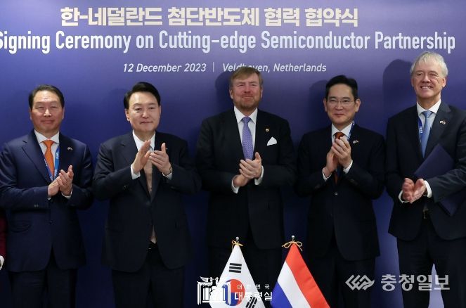 충청일보 김은경 기자 | 윤석열 대통령은 오늘(현지시간 12. 12, 화) 네덜란드의 빌렘-알렉산더 국왕과 함께 네덜란드의 반도체장비 생산기업 ASML의 본사를 방문했다. 이곳에서 양국 정상은 한국과 네덜란드, 유럽의 주요 반도체 기업 대표들과 간담회를 갖고 차세대 극자외선(EUV) 노광장비 생산현장을 함께 둘러봤다. ASML이 소재한 네덜란드의 벨트호벤은 수도 암스테르담에서 이동에만 왕복 4시간이 소요되며, 이번 ASML 방문은 그간 대통령 해외 순방 중 첫 번째 현지 기업 방문이다.