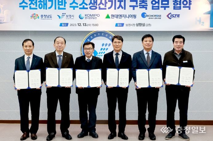 충청일보 박사현 기자 | 보령시는 충청남도, 한국중부발전, 현대엔지니어링, 테크로스 워터앤에너지, 아이에스티이와 지난 13일 시청 상황실에서 수전해기반 수소생산기지 구축 업무 협약을 체결했다.