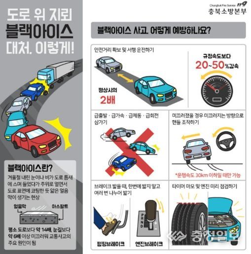 임병수 소방서장은 “블랙아이스는 새벽이나 아침에 주로 형성되며 다리, 터널 직후, 그늘진 도로, 산모퉁이 음지, 커브길 등 그늘진 곳에 육안으로 확인이 어려운 만큼 운전 시 앞차와의 안전거리를 확보하고 감속 운행하길 바란다”고 말했다.