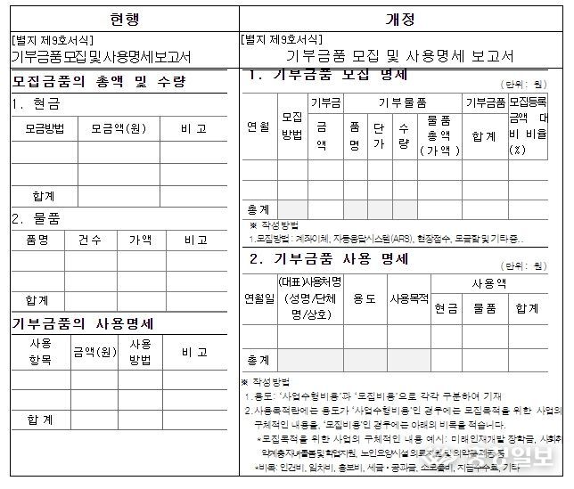개정안을 통해 모집 단체들의 기부금품 모집 및 사용에 대하여 ‘연월일, 사용처명, 사업목적 등’을 기재하도록 관련 서식을 개정*한다.