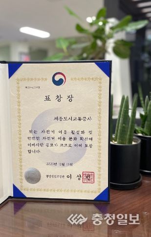 충청일보 김정운 기자 | 세종도시교통공사는 2023년 자전거 이용 활성화 유공 포상에서 행정안전부 장관 표창을 수상했다고 밝혔다.
