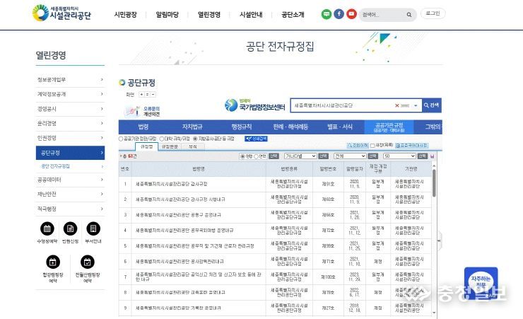 충청일보 김정운 기자 | 세종특별자치시시설관리공단이 지난 18일 법제처 국가법령정보센터를 통해 공단 전자규정집을 도입했다고 밝혔다.