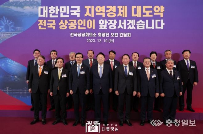 충청일보 김은경 기자 | 윤석열 대통령은 12월 19일 각 지역을 대표하는 전국상공회의소 회장단을 청와대 영빈관으로 초청해 오찬 간담회를 열었다. 오늘 오찬 간담회는 각 지역을 대표하는 상공인들과 격의 없이 소통하고 경제 활력 제고를 위한 민·관 ‘팀 코리아’ 협력을 강화하기 위해 마련됐다.