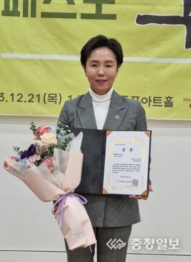 충청일보 박사현 기자 | 충남도의회 교육위원회 박미옥 의원(비례, 국민의힘)이 12월 21일 서울 영등포아트홀에서 열린 ‘제15회 2023 지방의원 매니페스토 약속대상’에서 좋은 조례 부문 수상자로 선정됐다.