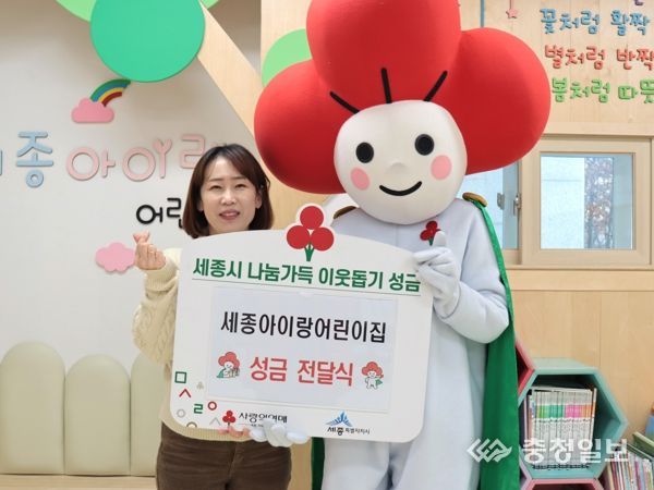 충청일보 김정운 기자 | 세종특별자치시 보람동에 위치한 세종아이랑어린이집은 세종사회복지공동모금회에 따뜻한 온정이 담긴 성금을 전달했다.