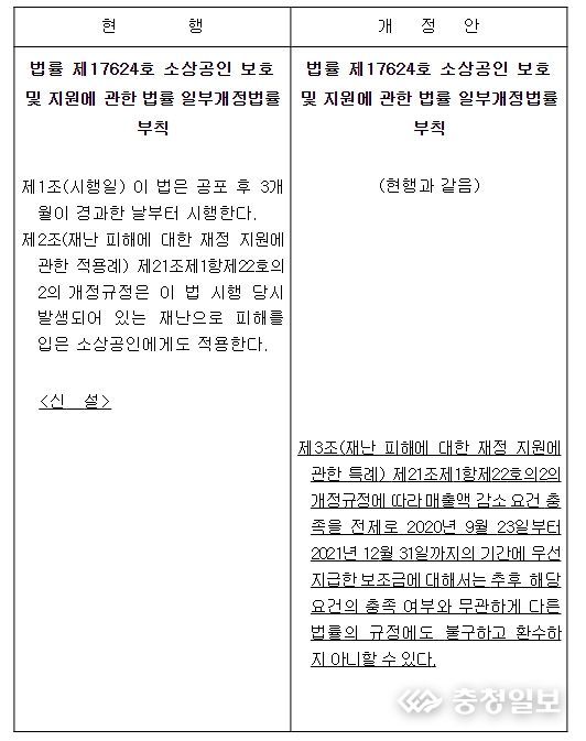 충청일보 김은경 기자 | 중소벤처기업부는 코로나19 초기 영세 소상공인에게 선지급했던 1, 2차 재난지원금에 대해 환수를 면제할 수 있는 근거를 담은 '소상공인 보호 및 지원에 관한 법률' 일부개정법률 공포안이 2일 국무회의에서 의결됐다고 밝혔다.