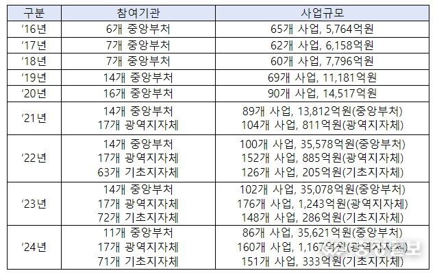 [지자체] 서울시가 강동구, 마포구 등 기초지자체 13개 기관과 함께 33개 사업을 통해 385억원(25.5%)을 지원한다. 그리고 경기도(12개 기관, 41개 사업, 153억원(10.2%)), 경상남도(8개 기관, 30개 사업, 107억원(7.1%)), 부산시(4개 기관, 23개 사업, 106억원(7.0%)), 광주시(4개 기관, 14개 사업, 105억원(7.0%)) 순으로 많은 예산을 투입하여 지원한다.