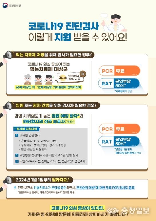 상기 대상자 외 입원 예정 환자, 보호자(간병인) 및 고위험 시설 종사자, 의사 소견에 따라 검사가 필요한 자는 PCR·RAT 검사비를 전액 본인이 부담해야 한다.
