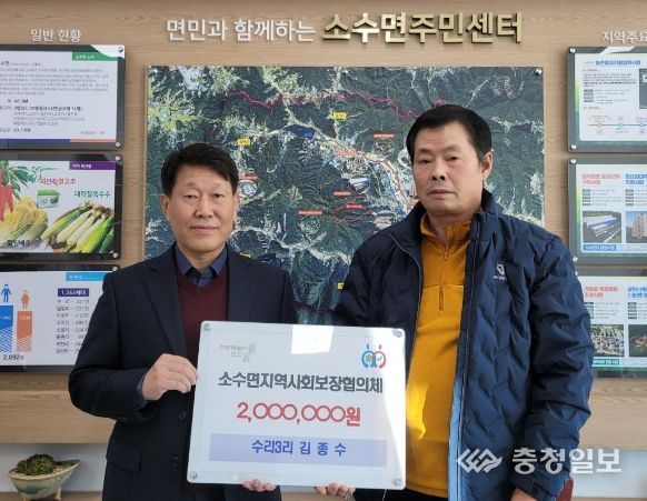 충청일보 김문호 기자 | 충북 괴산군 소수면 수리3리 주민 김종수 씨가 새해를 맞아 지난 8일 소수면사무소에 방문해 소수면 지역사회보장협의체에 후원금 200만 원을 기부했다.