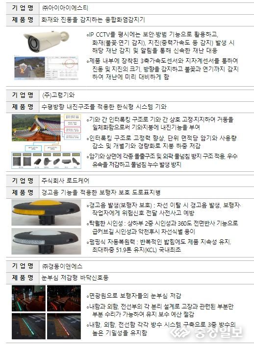 충청일보 김은경 기자 | 행정안전부는 공공성·혁신성 등이 우수하고 국민 안전관리 수준을 높일 수 있는 ‘2023년 하반기 재난안전 혁신제품’을 선정하고, 이에 대해 1월 10일 대한상공회의소(서울 중구 소재)에서 혁신제품 인증서 수여식을 개최한다.