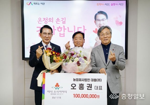 충청일보 박사현 기자 | 충남 서산시는 대풍(주) 오흥권 대표가 어려운 이웃돕기 성금 1억 원을 기부하며 충남사회복지공동모금회 아너소사이어티에 가입했다고 밝혔다.