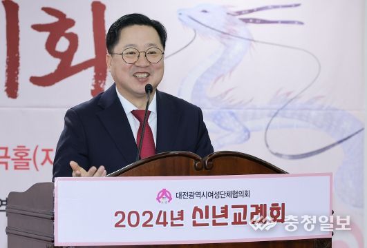 충청일보 곽채영 기자 | 대전시여성단체협의회가 주관하는 2024년 대전여성계 신년교례회가 9일 14개 여성단체 120여 명이 참석한 가운데 유성구 계룡스파텔 태극홀에서 개최됐다. 이장우 대전시장은 격려사에서 “대전이 고향인 우리의 아들, 딸들이 자랑스러워 할 수 있는 초일류 도시 대전을 만들어 나가겠다”라고 말했다.