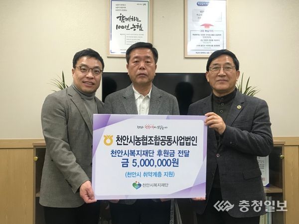 충청일보 박사현 기자 | 천안시농협조합공동사업법인은 11일 천안시 취약계층을 위해 사용해달라며 천안시복지재단에 후원금 500만 원을 전달했다.