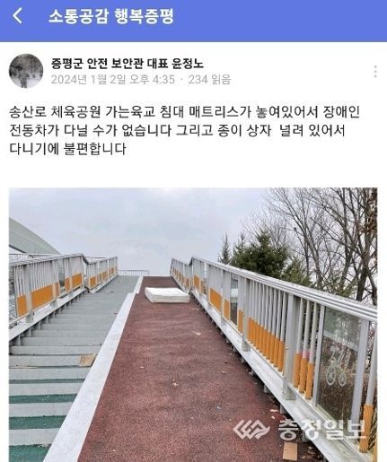 올해 ‘소통공감 행복증평 밴드’ 첫 번째 민원은 안전보안관 대표 윤정노 씨가 올린 송산로 체육공원 일원 불법폐기물 신고이다.